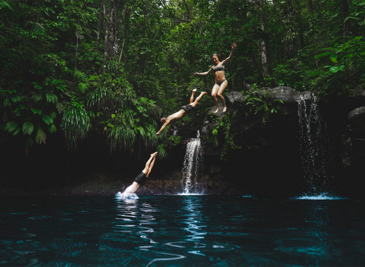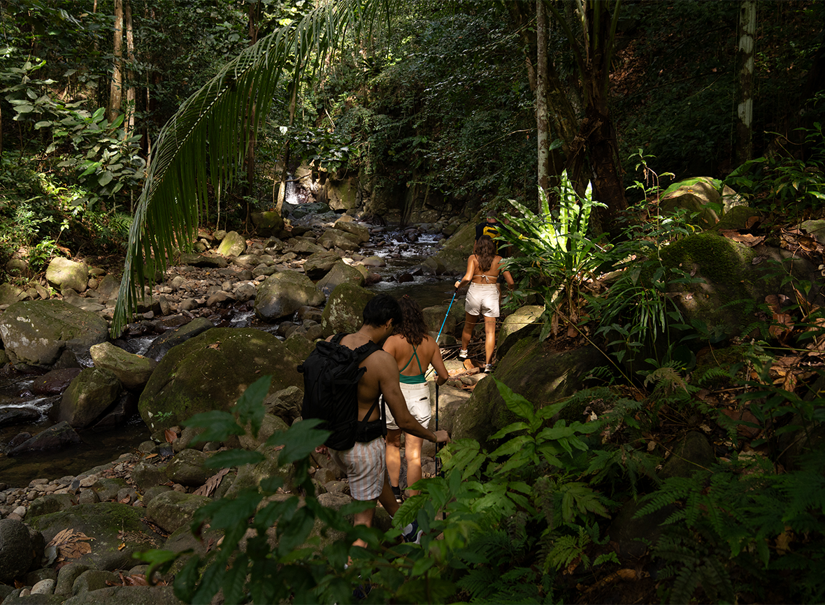 Mitt i den tropiska regnskogen väntar klara, naturliga pooler under forsande vatten. Ett dopp här är en skön paus från solen – svalt, stilla och omgivet av tät grönska.