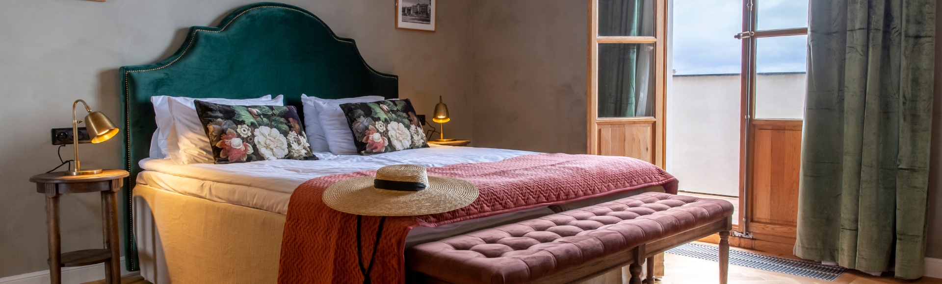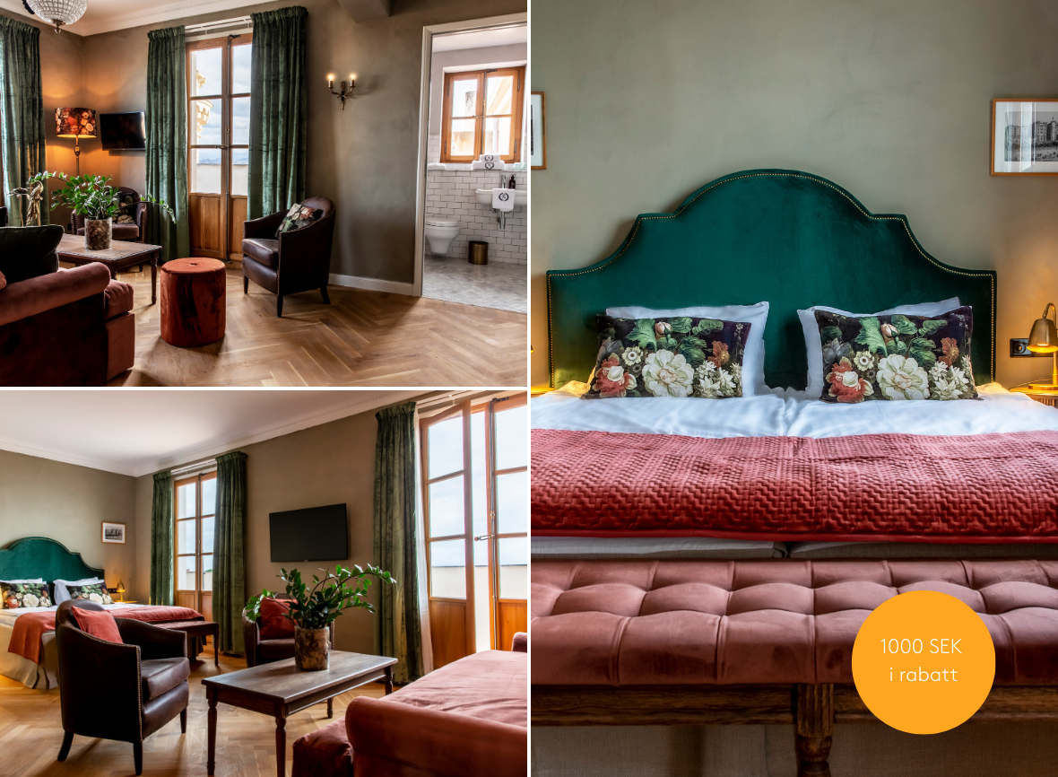 Välj den svit som passar er bäst – tornsvit, med havsutsikt eller en skön terrass. Rymliga sviter på 33–54 kvm, alla med samma rosa slott-känsla och gott om plats att landa i efter dagens upplevelser.